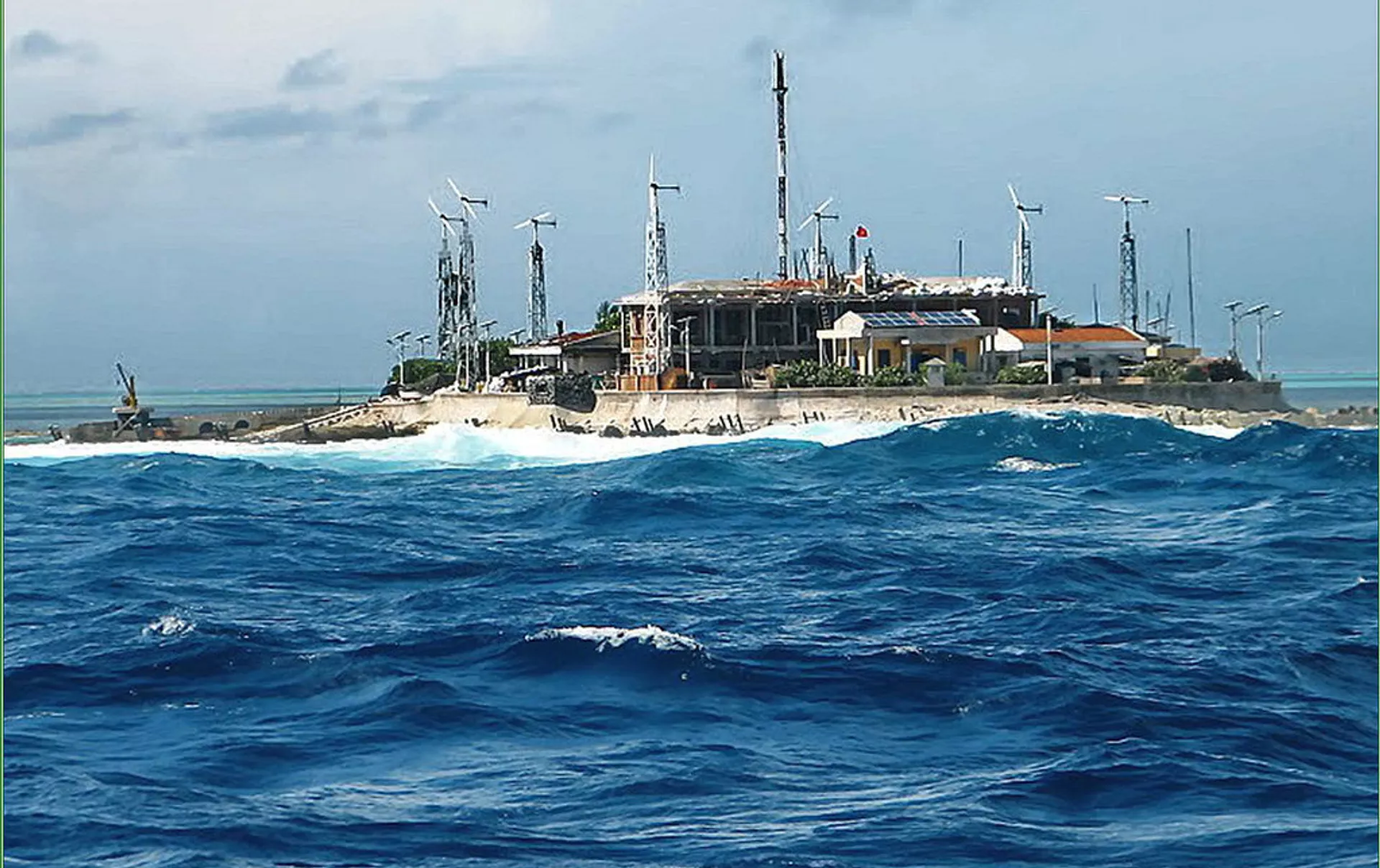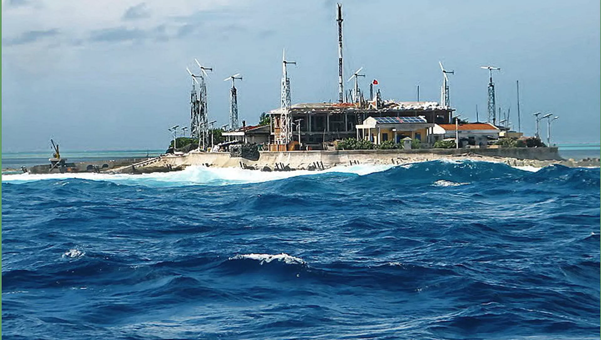 Ảnh chụp từ vệ tinh cho thấy hệ thống nghi là thiết bị phá sóng được lắp đặt trên Đá Vành Khăn thuộc quần đảo Trường Sa của Việt Nam.