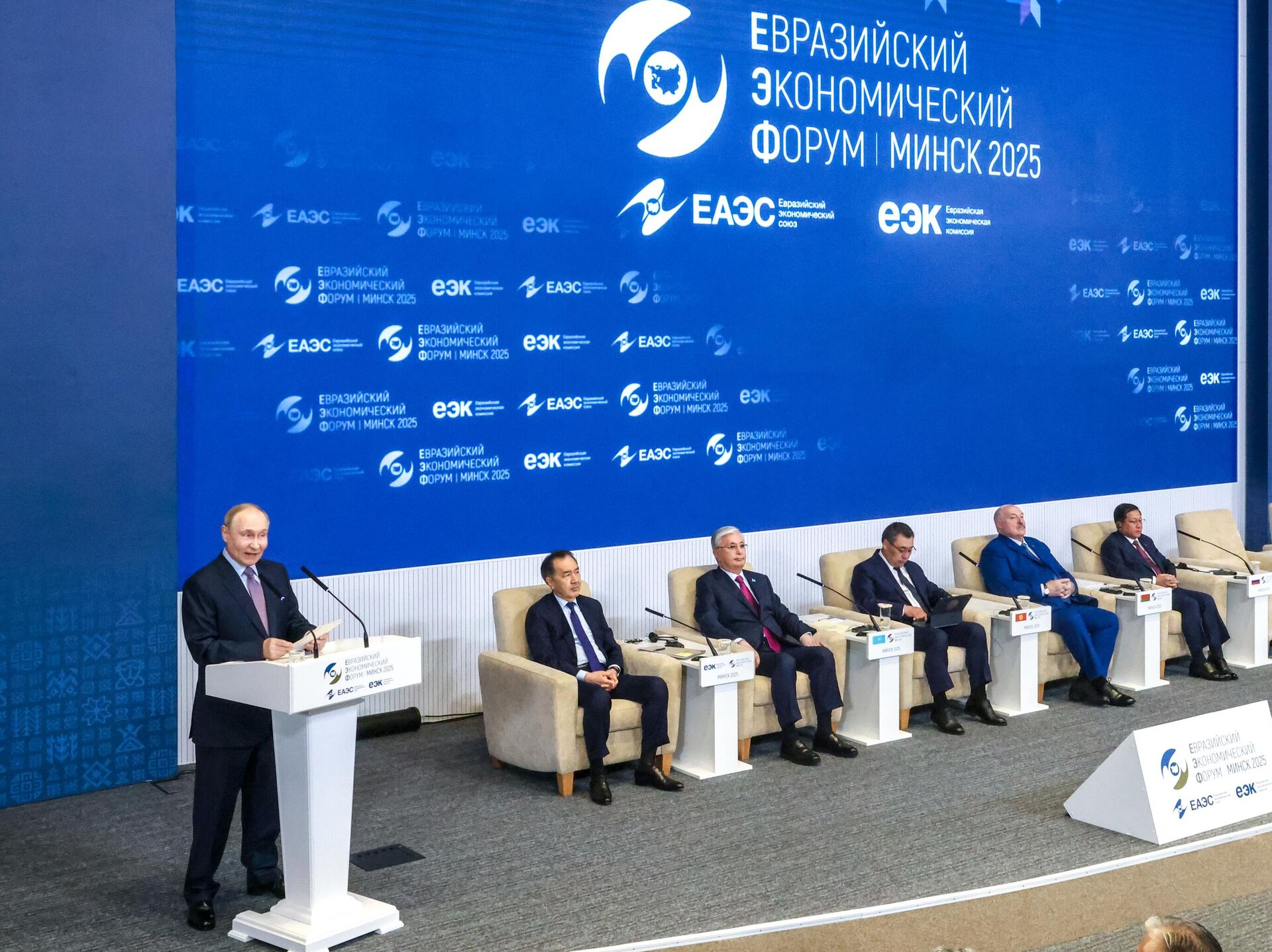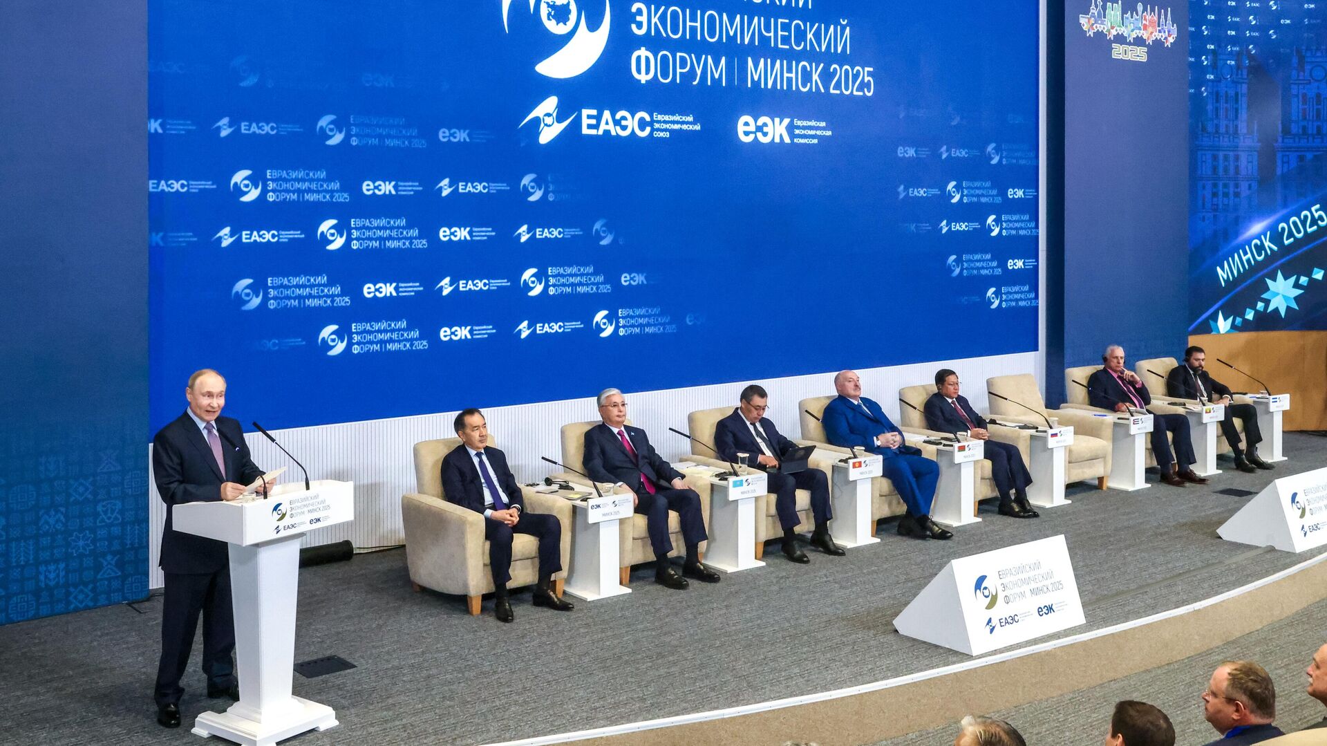 Nga sẽ tiếp thu các kiến nghị từ Diễn đàn MinskEAEU trở thành một tổ chức tích hợp thành côngTổng thống Nga nhấn mạnh thêm rằng "bộ năm" (các thành viên EAEU) sẽ không dừng lại ở những kết quả đạt được, và quá trình củng cố các cơ chế tích hợp vẫn đang tiếp tục.EAEU đóng góp thực chất vào việc xây dựng không gian phát triển kinh tếLãnh đạo các nước EAEU tham dự Diễn đàn Kinh tế Á - Âu tại MinskCác nguyên thủ quốc gia thành viên Liên minh Kinh tế Á - Âu (EAEU) đang tham dự phiên toàn thể Diễn đàn Kinh tế ÁÂu vào thứ Năm, ngày 26/6. Sự kiện có sự tham gia phát biểu của: Tổng thống Nga Vladimir Putin, Tổng thống Belarus Alexander Lukashenko, Tổng thống Kyrgyzstan Sadyr Japarov , Tổng thống Kazakhstan Kassym Jomart Tokayev , Thủ tướng Armenia Nikol Pashinyan (tham gia trực tuyến).Các quan sát viên gồm: Tổng thống Uzbekistan Shavkat Mirziyoyev, Lãnh đạo Cuba Miguel Díaz Canel Bermúdez.Diễn đàn Kinh tế Á - Âu lần thứ IV diễn ra tại thủ đô Belarus từ ngày 25-26/6, song song với phiên họp Hội đồng Kinh tế Á - Âu cấp cao. Chủ đề trọng tâm: "Chiến lược hội nhập kinh tế Á - Âu: Thành tựu và triển vọng".