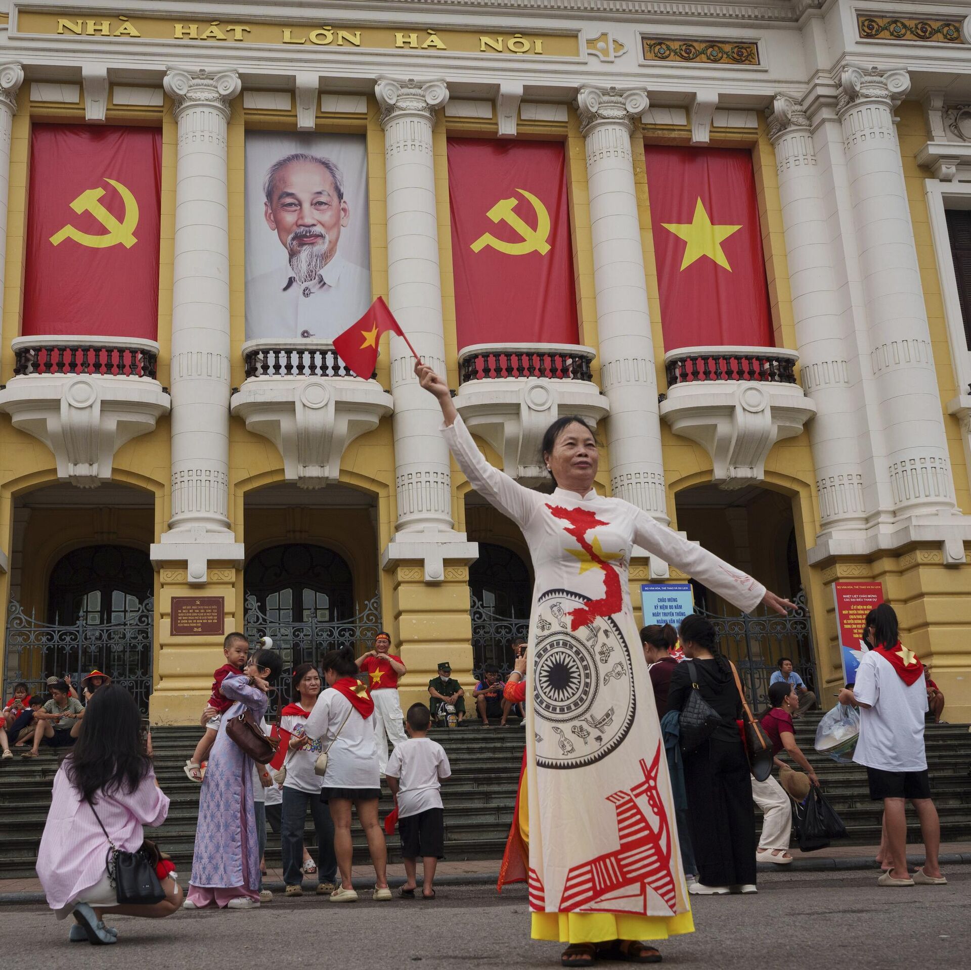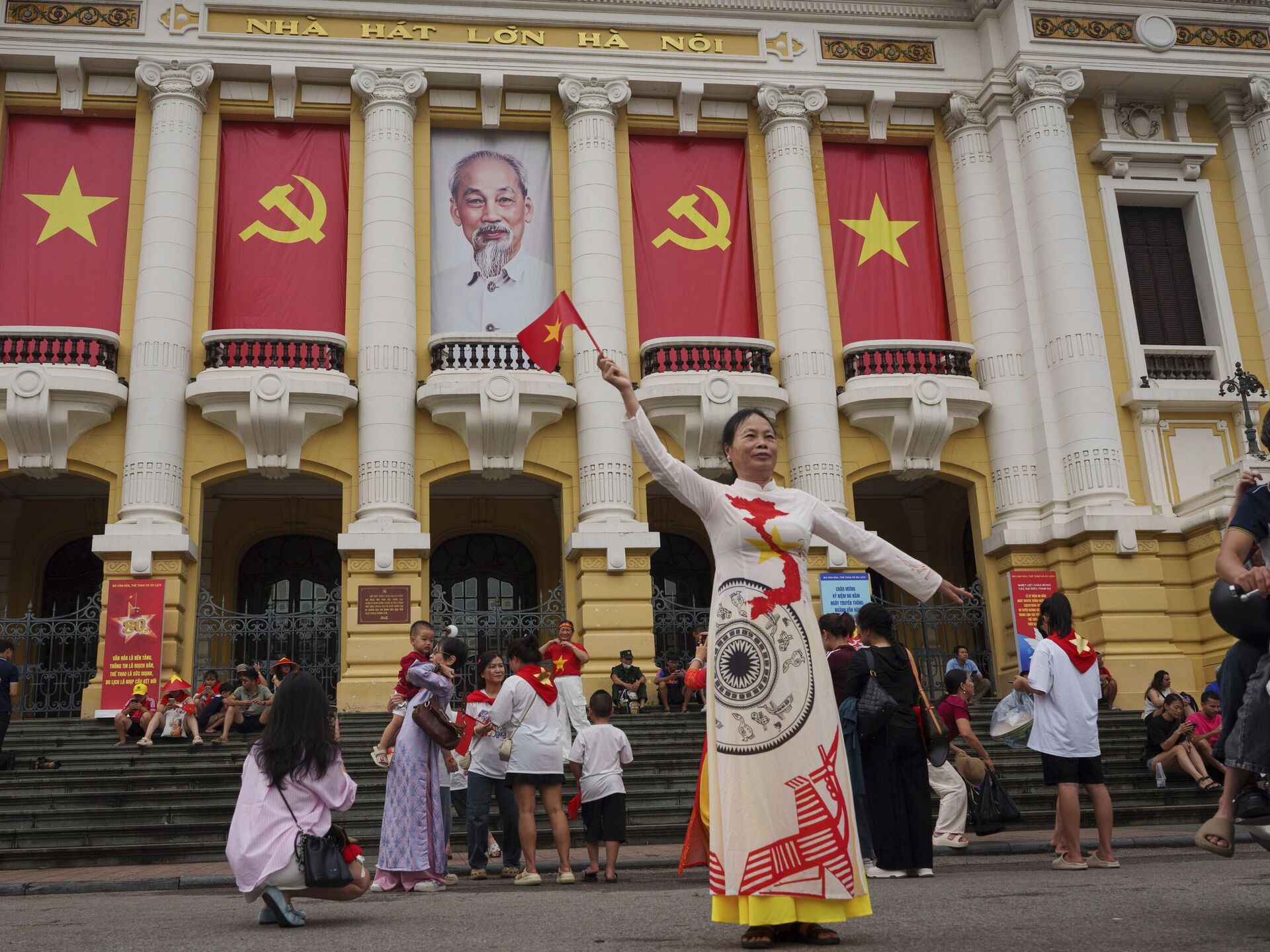 Người phụ nữ chụp ảnh trước Nhà hát Lớn, nơi các ban công được trang trí bằng cờ Việt Nam và cờ Đảng Cộng sản, tại khu phố cổ Hà Nội, Việt Nam