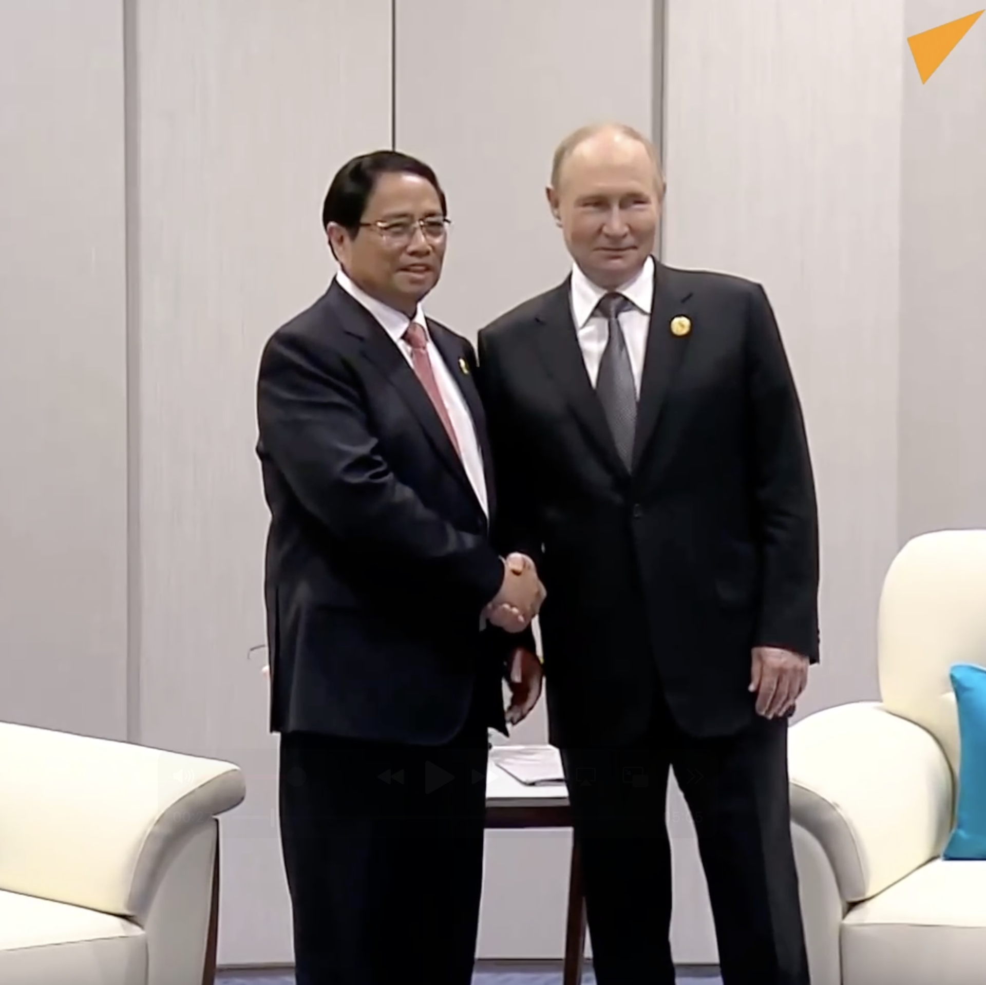 "Thưa đồng chí kính mến, thực ra sẽ rất kỳ quặc nếu như chúng ta không gặp nhau vào những thời điểm như thế này, bởi chúng ta thực sự có chương trình nghị sự rất rộng lớn, nhiều vấn đề cần được thảo luận, cụ thể là các thỏa thuận đã đạt được giữa chúng ta và cần được thực hiện", Thủ tướng Việt Nam Phạm Minh Chính phát biểu trong cuộc gặp nhà lãnh đạo Nga Vladimir Putin bên lề Hội nghị thượng đỉnh SCO.