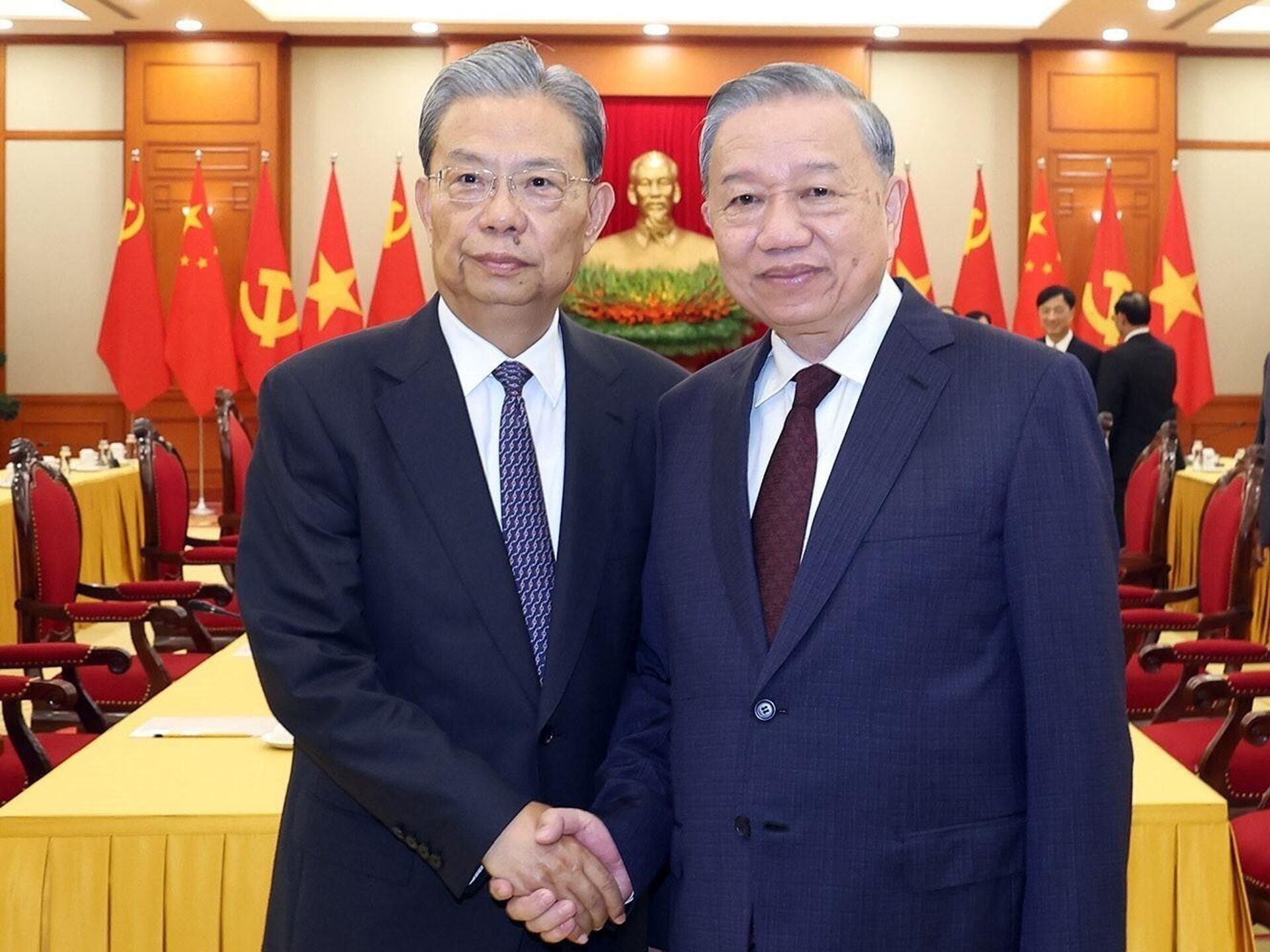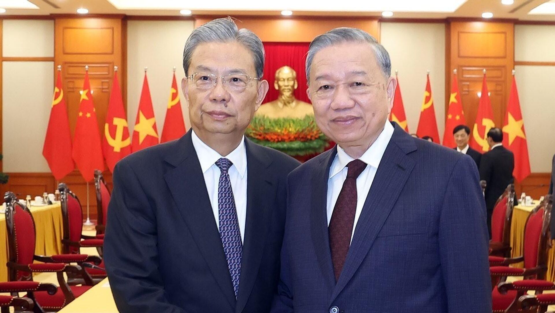 Về phía Việt Nam, tại cuộc hội đàm với Uỷ viên trưởng Nhân đại Trung Quốc, Tổng Bí thư Tô Lâm đã gửi lời thăm hỏi thân thiết và lời chúc tốt đẹp tới Tổng Bí thư, Chủ tịch nước Tập Cận Bình cùng lãnh đạo cấp cao Trung Quốc.