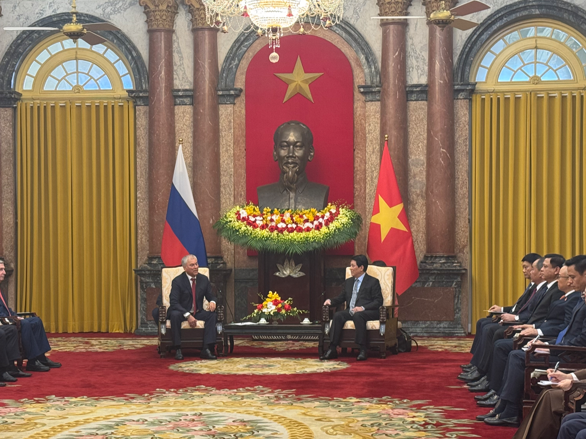 Theo đó, tại Phủ Chủ tịch, Chủ tịch nước Lương Cường tiếp Chủ tịch Duma Quốc gia Nga Vyacheslav Volodin đang có chuyến thăm chính thức Việt Nam.