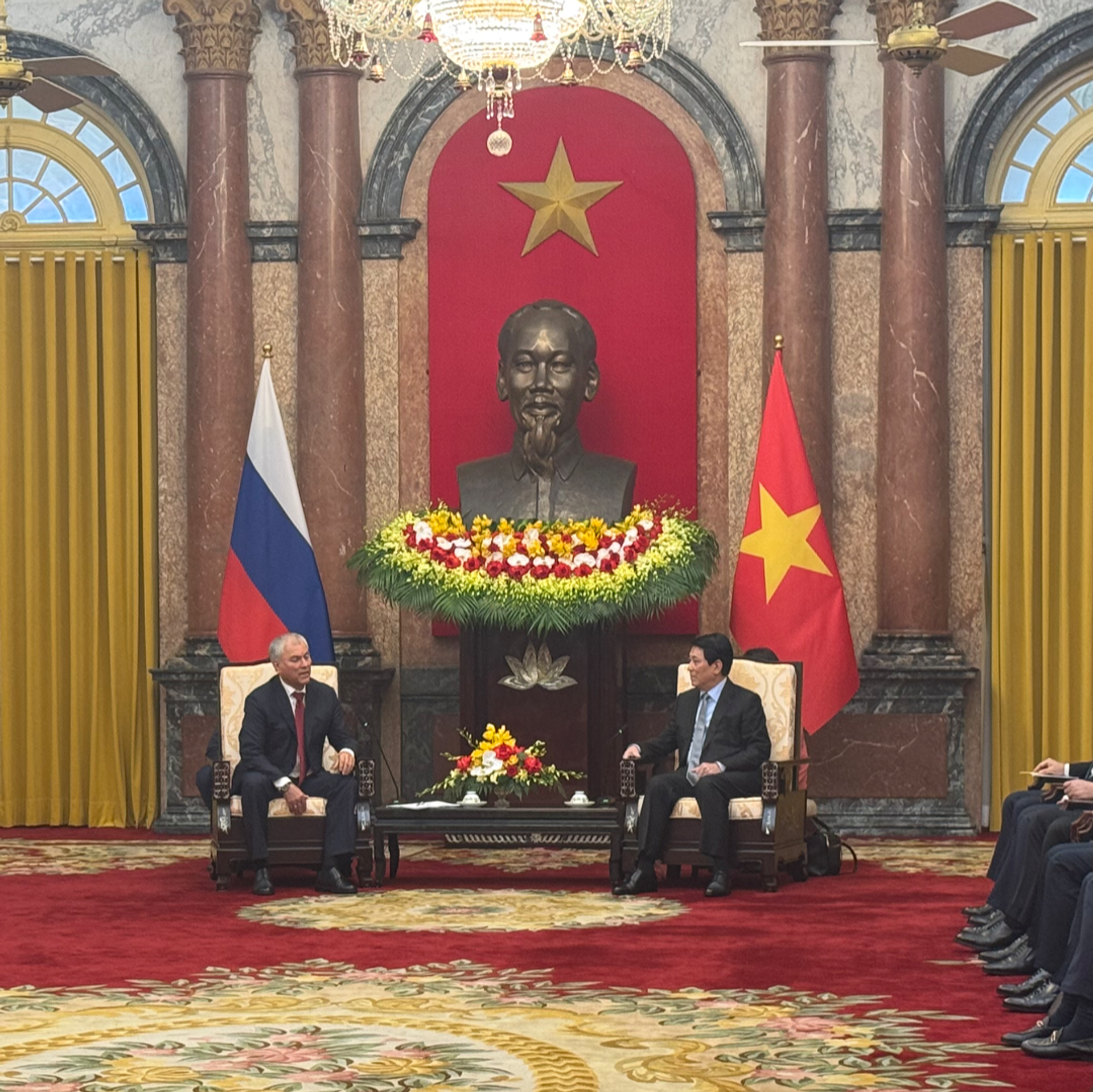 Chủ tịch Duma Quốc gia Nga Vyacheslav Volodin cho rằng cần phát huy hơn nữa vai trò của Ủy ban hợp tác liên Nghị viện và các Nhóm nghị sĩ hữu nghị, khẳng định Duma Quốc gia Nga ủng hộ hai bên hợp tác về kinh tế - thương mại, năng lượng - dầu khí và giáo dục - đào tạo.