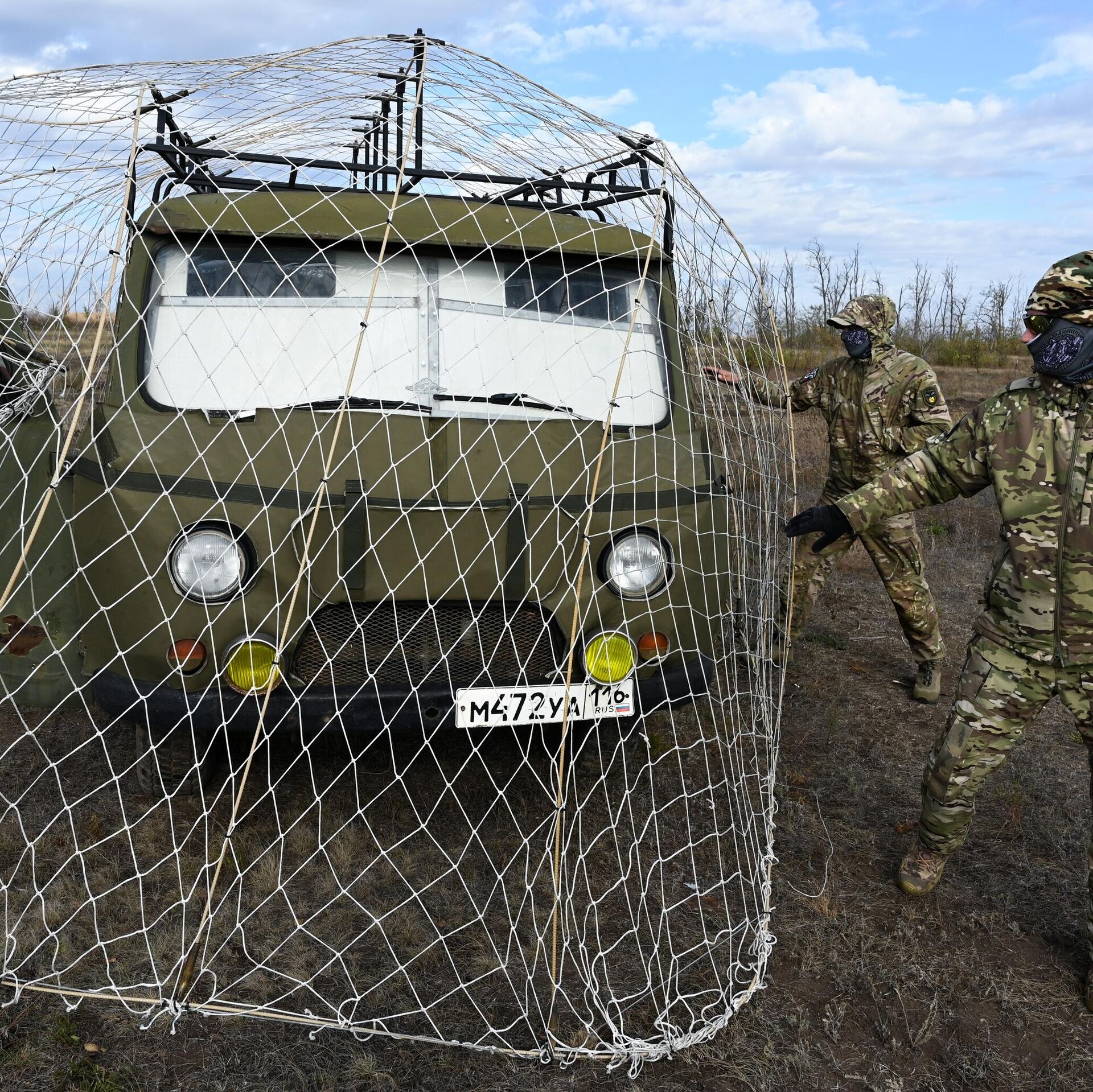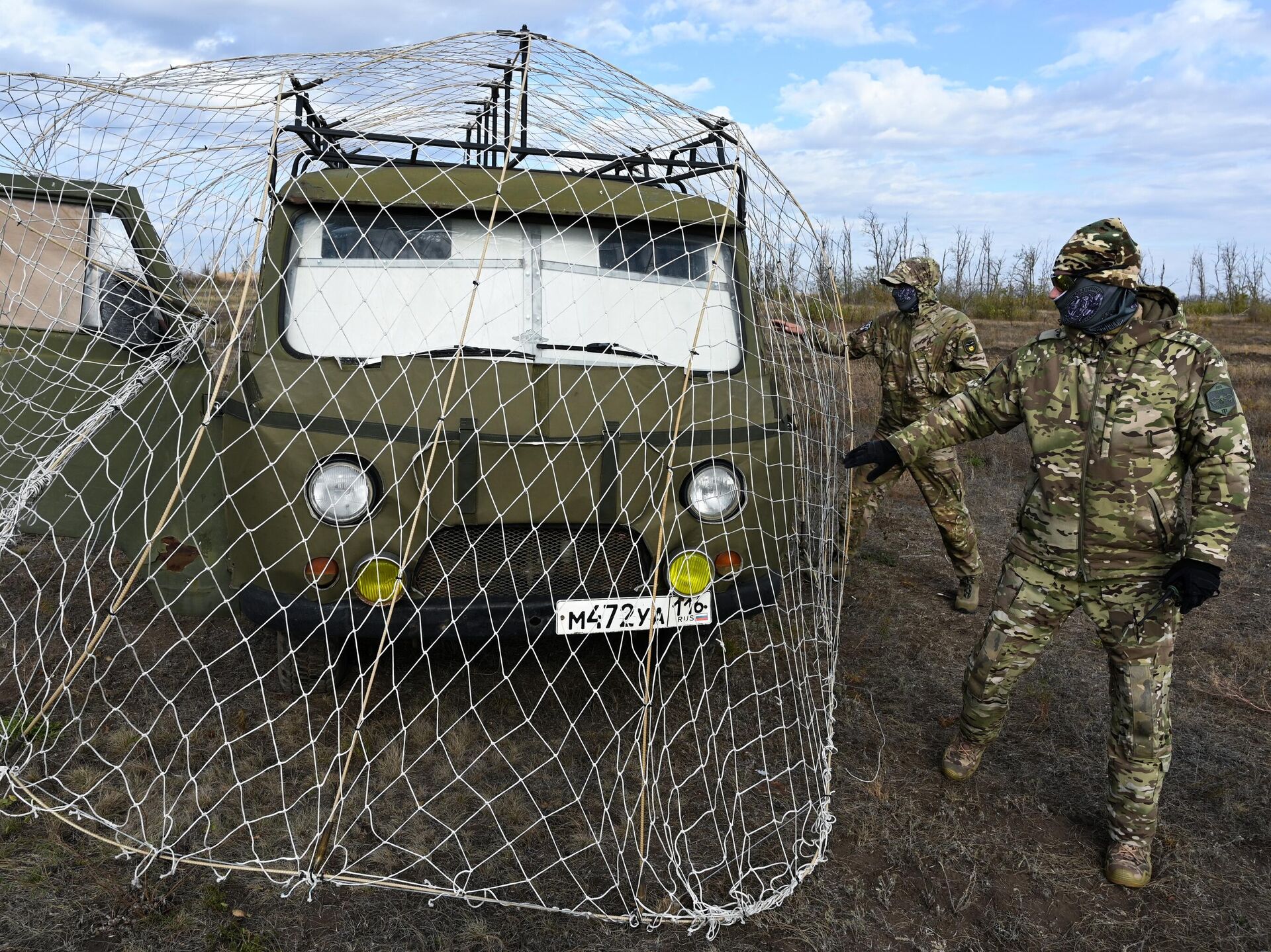 Binh sĩ đang chuẩn bị một chiếc xe được lắp đặt hệ thống lưới sắt bảo vệ (kiểu vỉ nướng) chống tấn công UAV cho đợt thử nghiệm trên thao trường ở tỉnh Rostov
