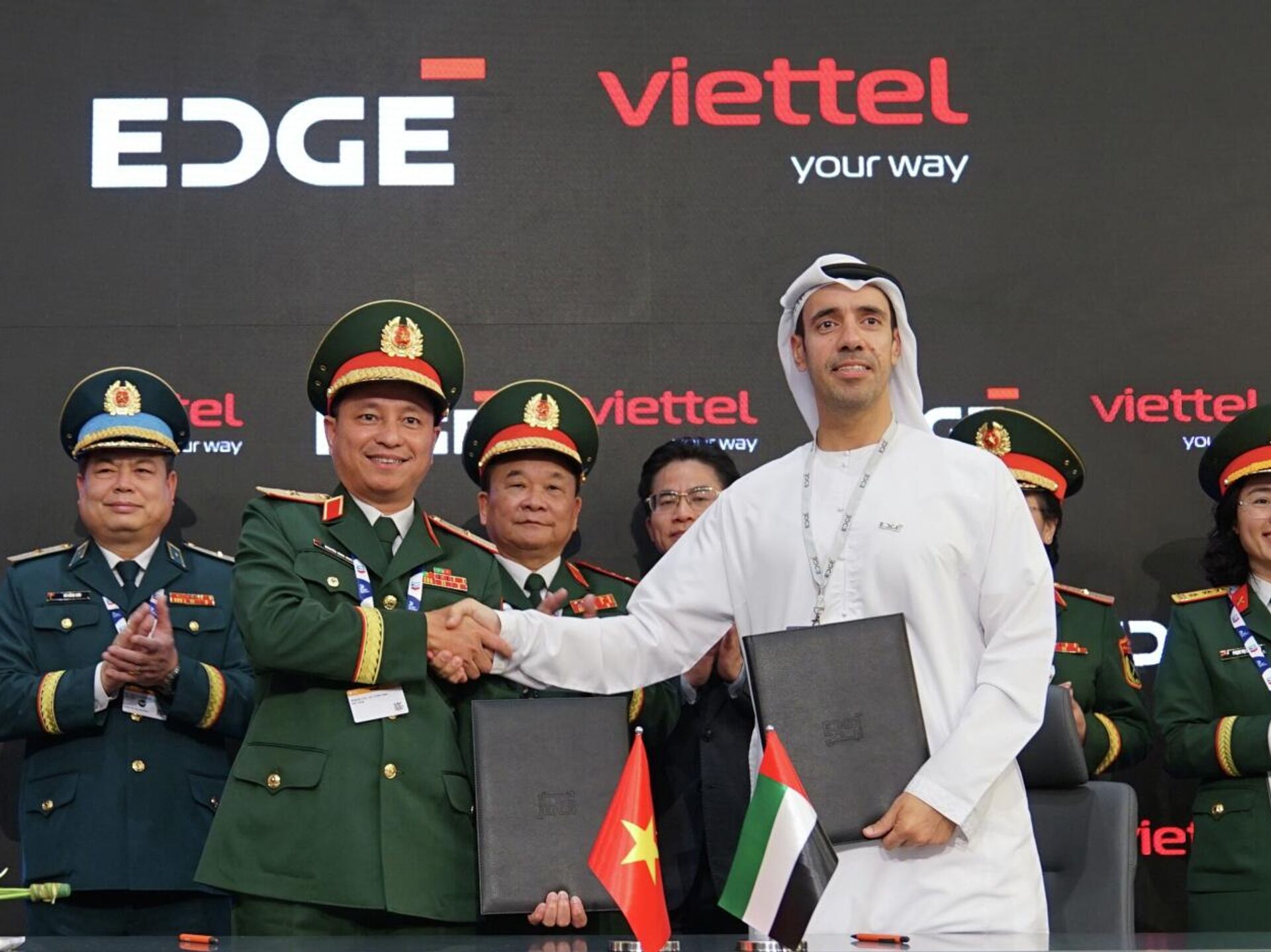 Đây được xem là bước đi chiến lược của Viettel về xuất khẩu sản phẩm công nghệ cao “Make in Viet Nam” và nghiên cứu phát triển các sản phẩm, công nghệ quốc phòng, lưỡng dụng tiên tiến.Đoàn Bộ Quốc phòng Việt Nam dự Triển lãm hàng không Dubai 2025Bộ Quốc phòng Việt Nam cho biết, nhận lời mời của Bộ Quốc phòng Các Tiểu vương quốc Ả Rập Thống nhất (UAE), đoàn đại biểu cấp cao Bộ Quốc phòng Việt Nam do Thượng tướng Hoàng Xuân Chiến - Thứ trưởng Bộ Quốc phòng - dẫn đầu đã tham dự Triển lãm Hàng không Dubai (Dubai Airshow 2025) tại Dubai, đồng thời thăm và làm việc với Bộ Quốc phòng UAE.Triển lãm Hàng không Dubai 2025 là một trong những sự kiện hàng không lớn nhất thế giới, thu hút gần 1.500 đơn vị đến từ 98 quốc gia.Triển lãm quy tụ hơn 200 máy bay các loại được trưng bày với quy mô ấn tượng, cùng hàng loạt công nghệ mới nhất trong lĩnh vực hàng không, quốc phòng và công nghiệp quân sự.Trong quá trình tham quan gian hàng và làm việc với các doanh nghiệp quốc phòng của UAE và một số quốc gia khác, Thứ trưởng Hoàng Xuân Chiến đề nghị các bên chủ động trao đổi, nghiên cứu khả năng hợp tác, phù hợp với năng lực từng phía, qua đó xác định phương hướng tăng cường hợp tác công nghiệp quốc phòng thời gian tới.Viettel ký kết hợp tác quốc phòng công nghệ cao tại UAENhân dịp thăm, làm việc tại UAE, dự Triển lãm hàng không Dubai (Dubai Airshow), Thượng tướng Hoàng Xuân Chiến đã chứng kiến Lễ ký Bản ghi nhớ giữa Tập đoàn Công nghiệp-Viễn thông Quân đội Viettel và Tập đoàn EDGE của UAE.EDGE là một trong những tập đoàn công nghệ và quốc phòng hàng đầu thế giới, được thành lập nhằm phát triển các giải pháp linh hoạt và đột phá phục vụ lĩnh vực quốc phòng, đồng thời thúc đẩy đổi mới và chuyển đổi công nghệ.Bản ghi nhớ giữa Viettel và EDGE đặt nền tảng cho việc mở rộng hợp tác sâu rộng trong nhiều lĩnh vực. Không chỉ tập trung vào sản phẩm và dịch vụ công nghiệp quốc phòng công nghệ cao, hai bên còn hướng tới các sản phẩm lưỡng dụng và dân dụng như hạ tầng viễn thông 5G, giải pháp và dịch vụ viễn thông, công nghệ thông tin, chất bán dẫn, camera AI, thiết bị IoT, an ninh mạng, logistics và thương mại điện tử...Một trong những trọng tâm của thỏa thuận là nghiên cứu thiết lập mô hình sản xuất OEM (nhà sản xuất thiết bị gốc) tại Việt Nam.Theo đó, Viettel và EDGE sẽ phối hợp sản xuất linh kiện, cụm lắp ráp và mô-đun liên quan đến các dòng sản phẩm của EDGE, phục vụ thị trường UAE và các thị trường xuất khẩu khác. Đồng thời, hai bên cũng đẩy mạnh nghiên cứu, trao đổi cơ hội chuyển giao công nghệ, đào tạo kỹ thuật và công nghệ trong những lĩnh vực phù hợp với nhu cầu phát triển.Phạm vi hợp tác sẽ được triển khai sau khi được cơ quan có thẩm quyền phê duyệt và phải tuân thủ pháp luật của mỗi quốc gia cũng như các quy định quốc tế liên quan.Việc ký kết Biên bản ghi nhớ với EDGE được xem là bước đi chiến lược của Viettel trong hành trình đưa các sản phẩm công nghệ cao “Make in Vietnam” xuất khẩu ra thế giới, đồng thời thúc đẩy nghiên cứu và phát triển các công nghệ lưỡng dụng và quốc phòng tiên tiến, góp phần nâng cao vị thế ngành công nghiệp quốc phòng Việt Nam trên trường quốc tế.
