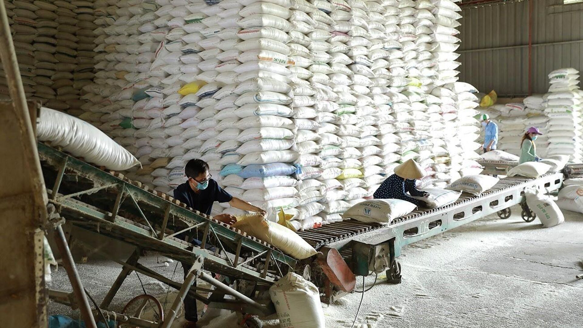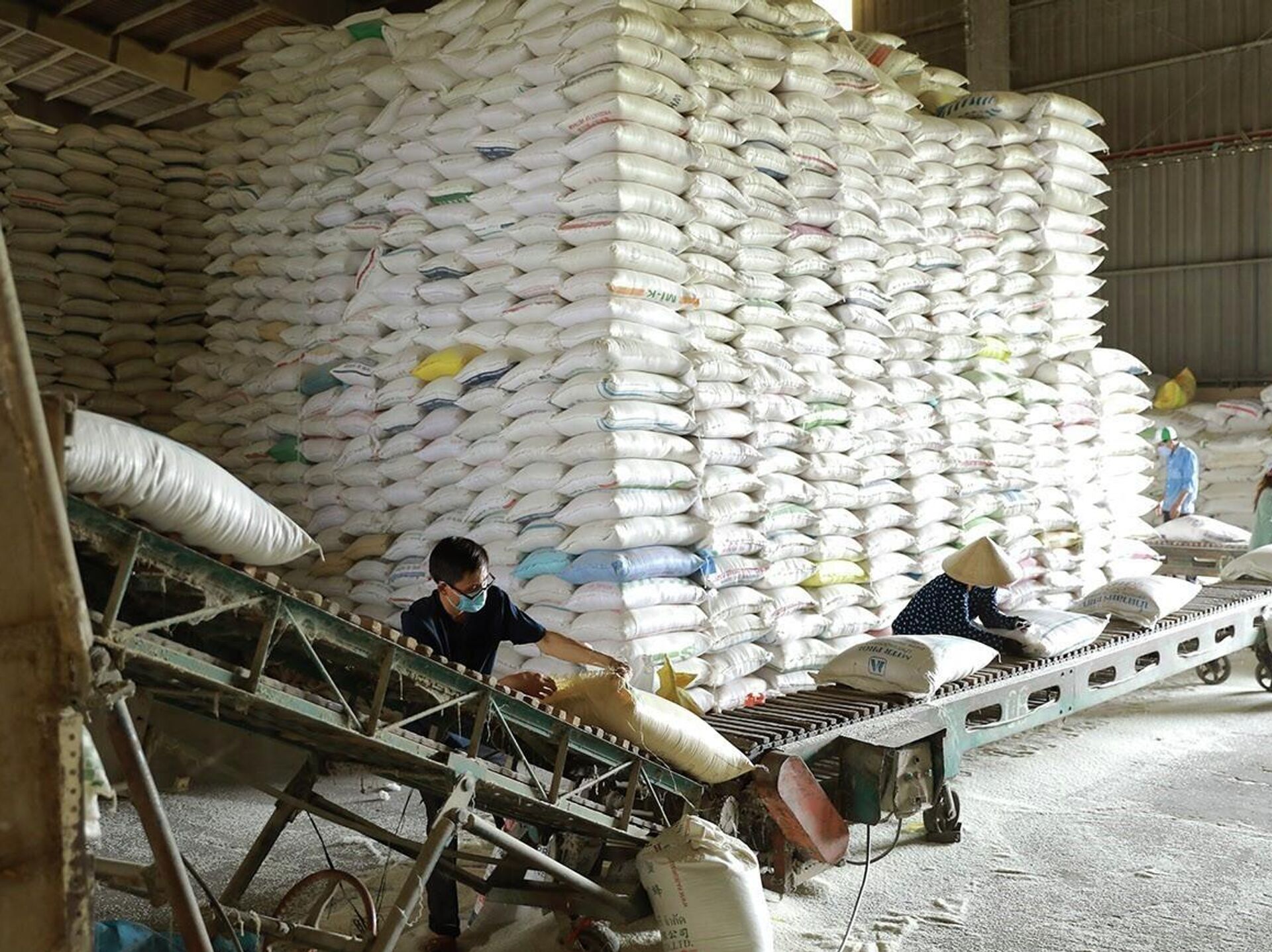 © Ảnh : TTXVN - Vũ Hữu SinhVận chuyển gạo thương phẩm phục vụ thị trường trong nước và xuất khẩu tại nhà máy của Tổng công ty Lương thực miền Nam, thành phố Cần Thơ