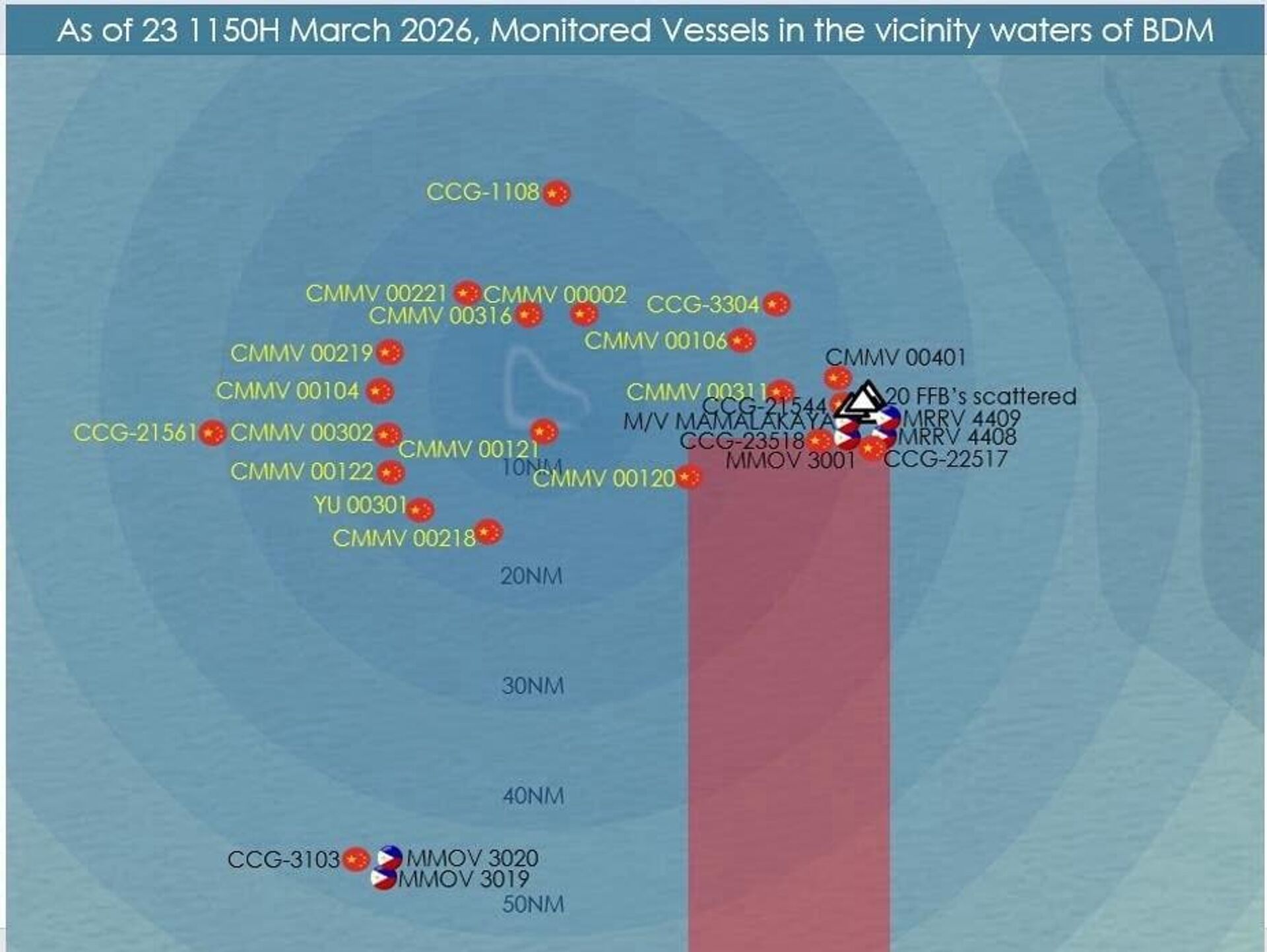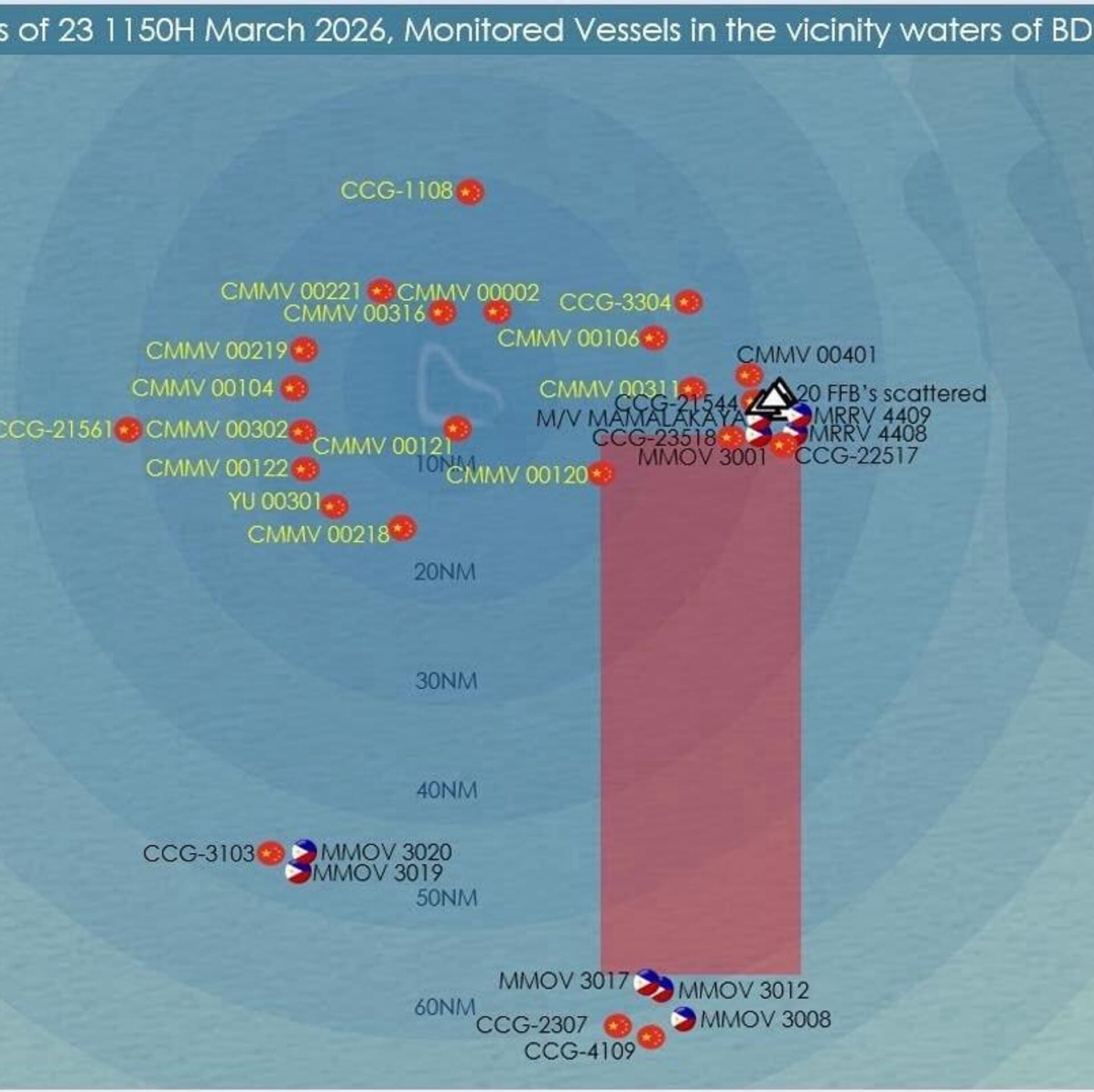 Theo thông tin từ phía Philippines, khu vực được chỉ định là một khu vực hình chữ nhật ở phần phía nam của bãi đá.Chuyến bay tuần tra trong khu vực đã ghi nhận được 6 tàu của Cảnh sát biển Trung Quốc, 20 tàu của lực lượng tuần tra hải quân và 1 tàu chiến của Quân đội Nhân dân Trung Quốc.Sự kiện xảy ra sau khi có thông tin về việc Trung Quốc truy đuổi hơn 20 tàu đánh cá của Philippines. Đáp lại, Philippines đã điều 2 tàu Cảnh sát biển và 5 tàu tuần tra đánh cá đến khu vực này, đồng thời cung cấp hỗ trợ cho các ngư dân.Đặc biệt, các tàu Trung Quốc trước đây đã từng truy đuổi tàu đánh cá Philippines, và lần đầu tiên, lực lượng không quân của Quân đội Nhân dân Trung Quốc đã tham gia vào chiến dịch này qua liên lạc vô tuyến.