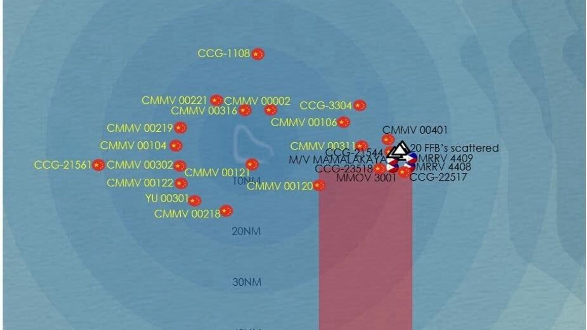 Trung Quốc truy đuổi hơn 20 tàu đánh cá của Philippines. Đáp lại, Philippines đã điều 2 tàu Cảnh sát biển và 5 tàu tuần tra đánh cá đến khu vực này, đồng thời cung cấp hỗ trợ cho các ngư dân.