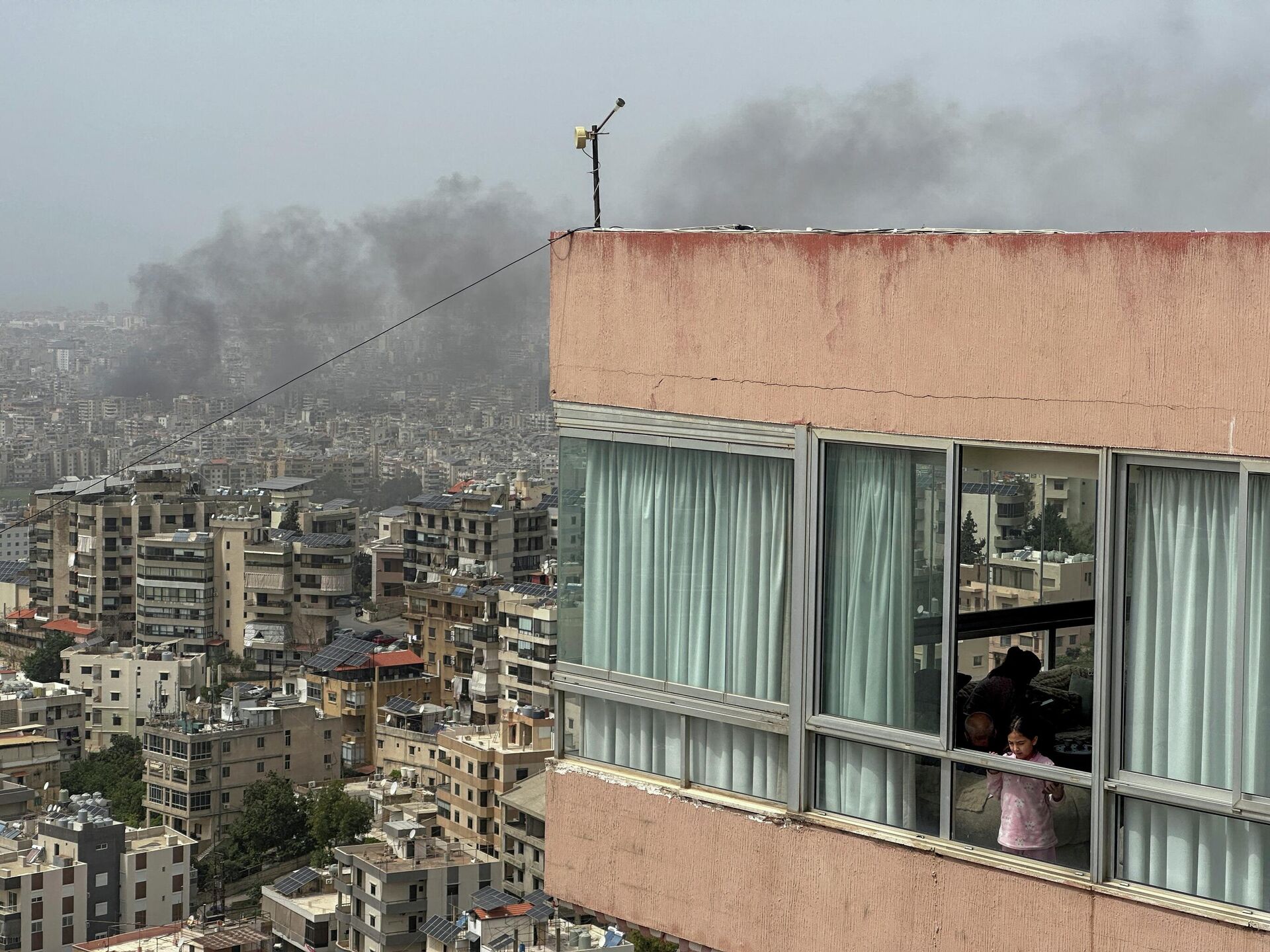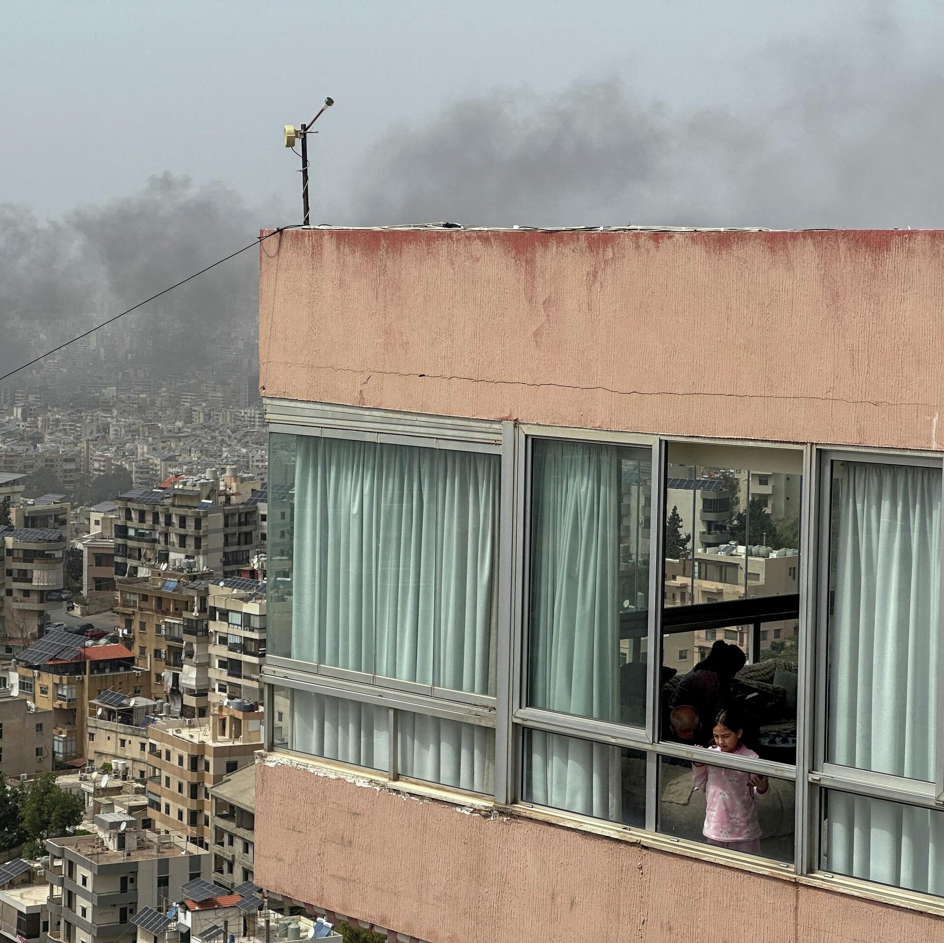 Một cô gái nhìn ra ngoài cửa sổ khi khói bốc lên sau cuộc không kích của Israel vào vùng ngoại ô phía nam Beirut, Lebanon - Sputnik Việt Nam, 1920, 10.04.2026