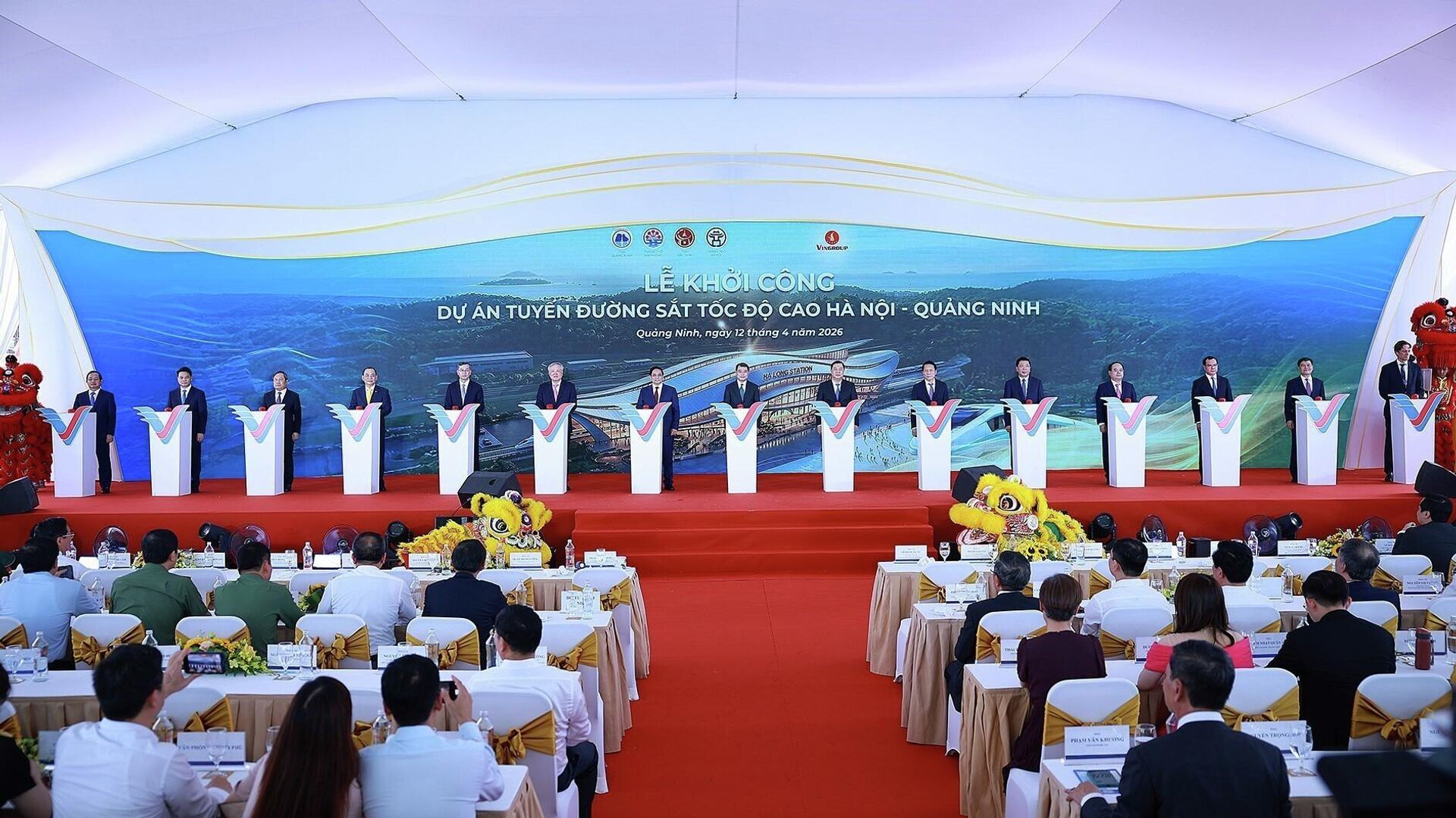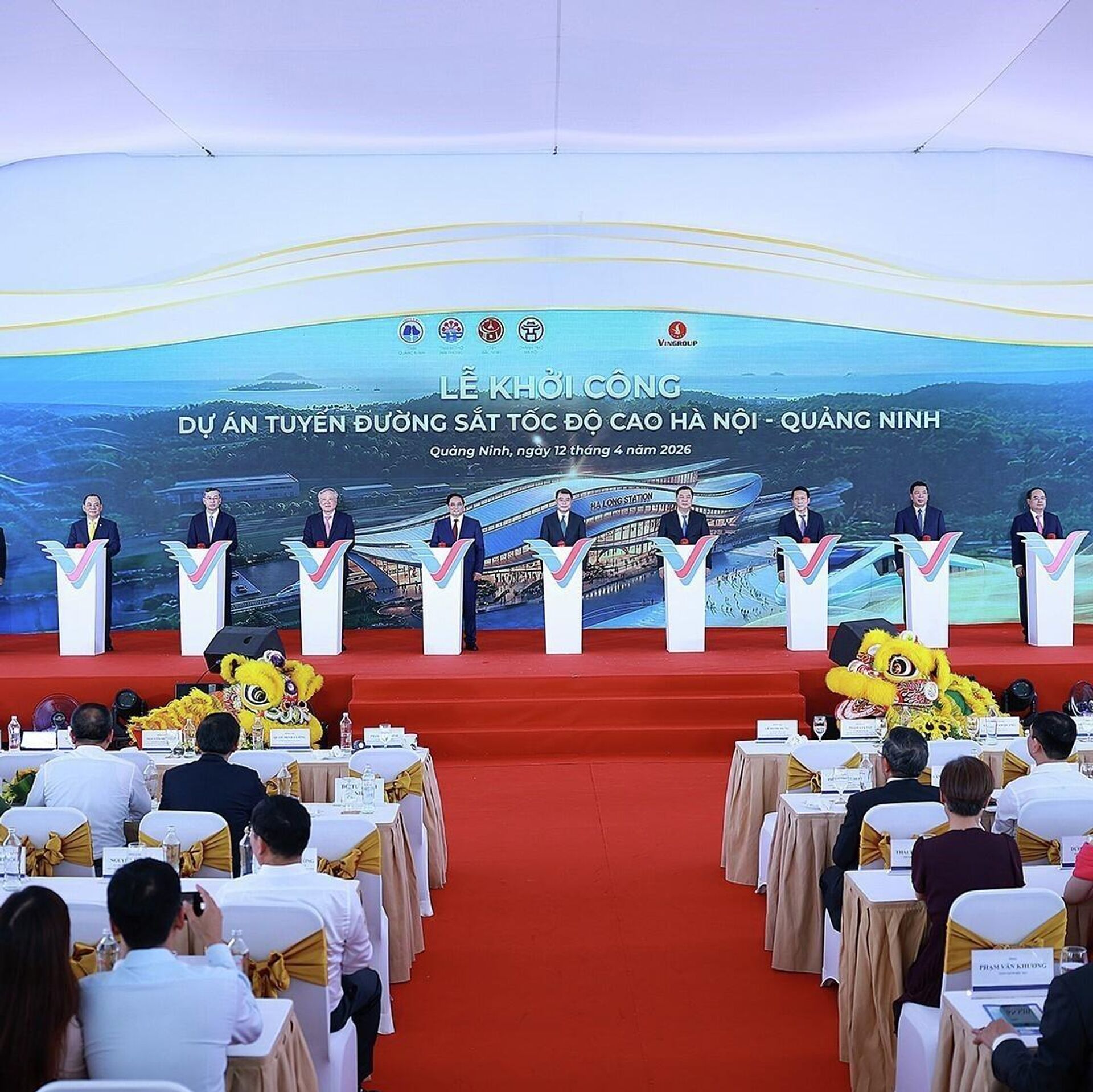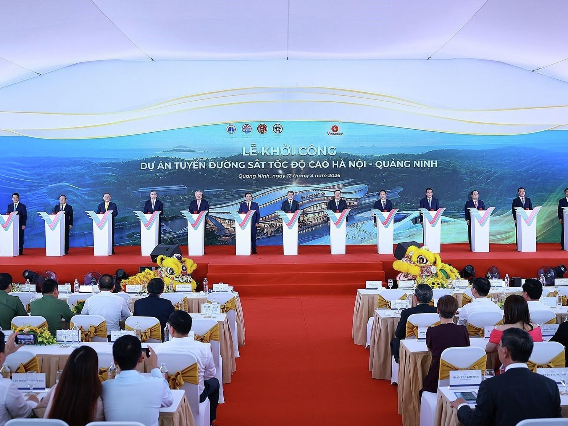 Khởi công dự án đường sắt cao tốc Hà Nội - Quảng NinhTham dự sự kiện có nhiều lãnh đạo và nguyên lãnh đạo cấp cao của Đảng, Nhà nước. Trong đó có nguyên Ủy viên Bộ Chính trị, nguyên Thủ tướng Chính phủ Phạm Minh Chính; Ủy viên Bộ Chính trị, Phó Thủ tướng Thường trực Chính phủ Phạm Gia Túc; nguyên Ủy viên Bộ Chính trị, nguyên Phó Thủ tướng Thường trực Chính phủ Nguyễn Hòa Bình; Ủy viên Bộ Chính trị, Bộ trưởng Bộ Công an, Đại tướng Lương Tam Quang. Ủy viên Bộ Chính trị, Chủ tịch Quốc hội Trần Thanh Mẫn đã gửi lẵng hoa chúc mừng. Cùng dự còn có lãnh đạo các ban, bộ, ngành Trung ương và nhiều địa phương.Dự án do Công ty Cổ phần Đầu tư và Phát triển đường sắt cao tốc VinSpeed, thuộc Tập đoàn Vingroup, làm chủ đầu tư. Tổng mức đầu tư hơn 147.000 tỷ đồng, tương đương trên 5,6 tỷ USD, chưa bao gồm chi phí giải phóng mặt bằng. Theo kế hoạch, công trình sẽ hoàn thành vào cuối ộ Chính trịnăm 2028. Khi đưa vào vận hành, thời gian di chuyển giữa Hà Nội và Quảng Ninh dự kiến rút ngắn 5-7 lần, còn khoảng 23 phút.Tuyến đường dài 120,2 km, đi qua bốn địa phương gồm Hà Nội, Bắc Ninh, Hải Phòng và Quảng Ninh. Công trình được thiết kế đường đôi, khổ ray tiêu chuẩn 1.435 mm, điện khí hóa toàn tuyến. Tốc độ khai thác tối đa đạt 350 km/h, riêng đoạn qua Hà Nội giới hạn ở mức 120 km/h.Dự án dự kiến sử dụng thế hệ tàu cao tốc mới và hiện đại, đi kèm hệ thống thông tin, tín hiệu và thiết bị đồng bộ hàng đầu thế giới do Tập đoàn Siemens Mobility của Đức cung cấp. Trong quá trình vận hành, công nghệ sẽ từng bước được chuyển giao cho VinSpeed.Điểm đầu của tuyến đặt tại ga Cổ Loa (Hà Nội), điểm cuối tại ga Hạ Long (Quảng Ninh). Trên tuyến có ba ga trung chuyển gồm Gia Bình (Bắc Ninh), Ninh Xá (Hải Phòng), Yên Tử (Quảng Ninh) và một depot bố trí tại ga Hạ Long.Phát biểu tại lễ khởi công, ông Michael Peter, Tổng giám đốc toàn cầu của Siemens Mobility, khẳng định tập đoàn sẽ cung cấp cho Việt Nam công nghệ tàu cao tốc tiên tiến, đảm bảo hiệu quả và an toàn, đã được kiểm chứng trên toàn cầu. Ông cũng nhấn mạnh cam kết hợp tác lâu dài với Vingroup, bao gồm chuyển giao công nghệ sâu rộng, phối hợp lắp ráp và bảo trì, hướng tới hình thành một hệ sinh thái đường sắt cao tốc hoàn toàn mới tại Việt Nam.Ông Bùi Văn Khắng, Phó Bí thư Tỉnh ủy, Chủ tịch UBND tỉnh Quảng Ninh, nhận định đây là siêu dự án mang theo nhiều kỳ vọng lớn. Công trình không chỉ thể hiện năng lực và cam kết của nhà đầu tư, mà còn cho thấy vai trò ngày càng rõ nét của khu vực kinh tế tư nhân trong phát triển hạ tầng chiến lược quốc gia.Theo lãnh đạo tỉnh Quảng Ninh, địa phương sẽ tiếp tục phối hợp chặt chẽ với các bộ, ngành Trung ương và chủ đầu tư trong suốt quá trình triển khai. Các khó khăn, vướng mắc sẽ được xử lý kịp thời. Công tác giải phóng mặt bằng, tái định cư và các điều kiện liên quan sẽ được đảm bảo để dự án triển khai thuận lợi, đúng tiến độ và đạt chất lượng cao.Ông Bùi Văn Khắng cũng cho rằng, với vai trò là tuyến đường sắt cao tốc liên vùng đầu tiên, dự án Hà Nội - Quảng Ninh không chỉ tạo động lực phát triển mạnh mẽ cho vùng kinh tế trọng điểm Bắc Bộ, mà còn mở ra giai đoạn tăng tốc mới. Qua đó góp phần hiện thực hóa mục tiêu nâng cao năng lực cạnh tranh quốc gia.Đại diện chủ đầu tư, ông Nguyễn Việt Quang, Phó Chủ tịch kiêm Tổng giám đốc Tập đoàn Vingroup, cho biết việc khởi công dự án tiếp tục khẳng định quyết tâm của tập đoàn trong phát triển hạ tầng. Mục tiêu là từng bước xây dựng hệ thống giao thông hiện đại theo tiêu chuẩn quốc tế, thúc đẩy kinh tế - xã hội và nâng cao chất lượng sống của người dân.Ông Nguyễn Việt Quang cũng cho biết thêm, đây là dự án thứ hai do VinSpeed triển khai. Trước đó, cuối năm 2025, doanh nghiệp đã khởi công tuyến Bến Thành - Cần Giờ tại TP.HCM, dự kiến hoàn thành vào quý IV/2028. Việc đồng thời triển khai hai tuyến đường sắt cao tốc ở hai miền Bắc - Nam cho thấy năng lực tổ chức và triển khai thực tế của VinSpeed, đồng thời đặt nền móng cho ngành công nghiệp đường sắt và công nghiệp hỗ trợ quy mô tỷ USD tại Việt Nam.Tại buổi lễ, Thủ tướng Lê Minh Hưng cùng các lãnh đạo và nguyên lãnh đạo Đảng, Nhà nước, đại diện các bộ, ngành và địa phương đã thực hiện nghi thức khởi công dự án. Các đại biểu bày tỏ tin tưởng công trình sẽ hoàn thành đúng tiến độ, tạo động lực cho một giai đoạn phát triển mới, góp phần đưa đất nước phát triển theo hướng giàu mạnh, văn minh và nâng cao đời sống nhân dân.