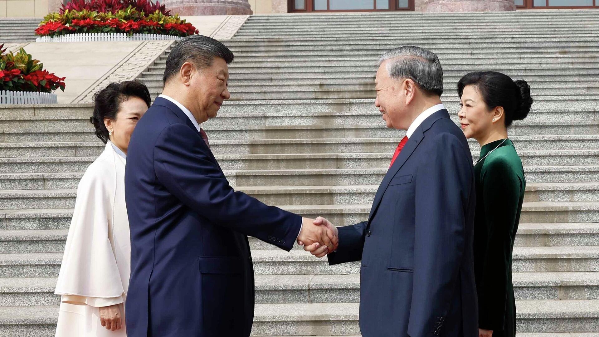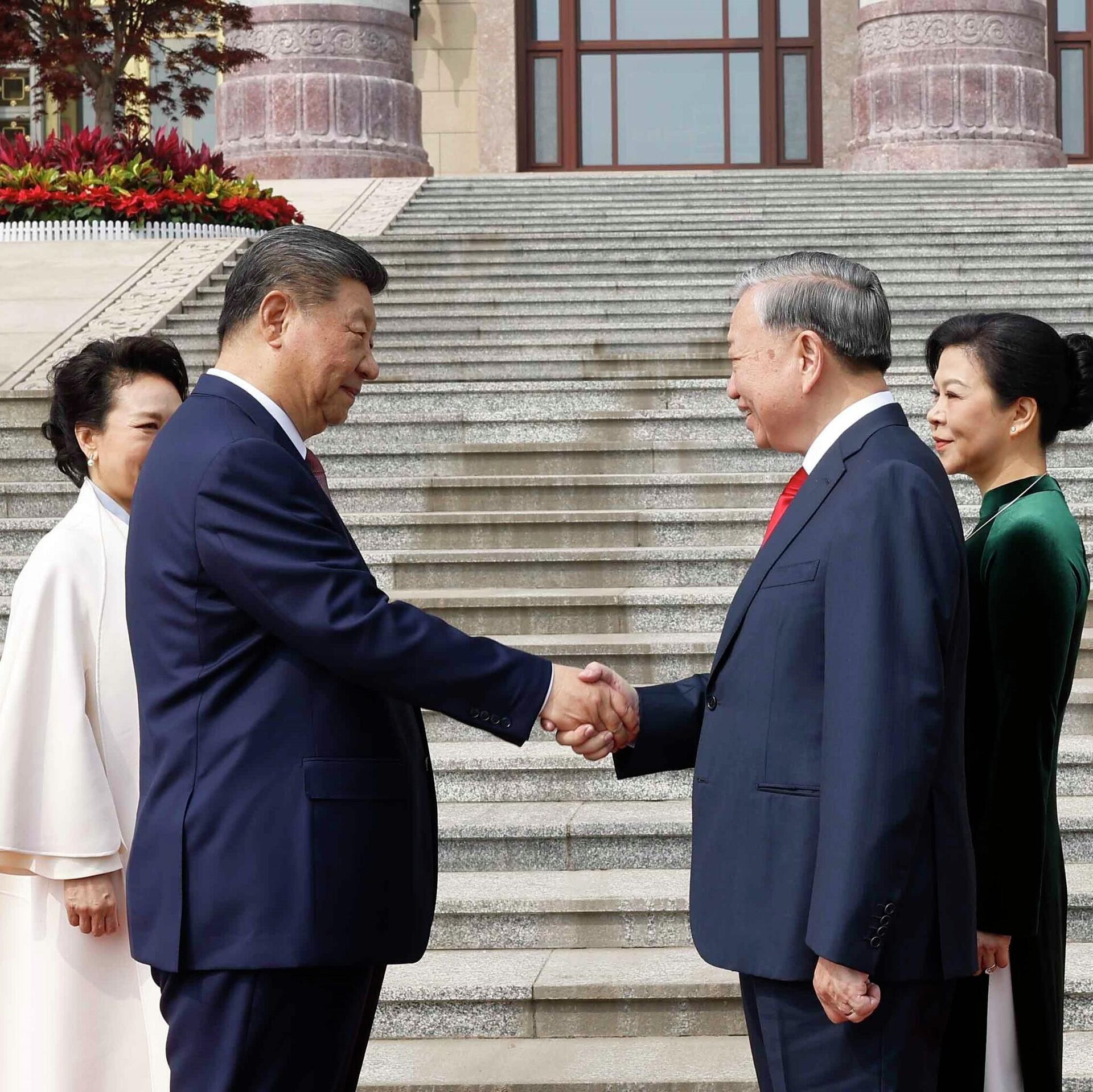 Tổng Bí thư, Chủ tịch nước Trung Quốc Tập Cận Bình và Phu nhân ra tận nơi xe dừng để đón Tổng Bí thư, Chủ tịch nước Tô Lâm và Phu nhân. Hai nhà lãnh đạo cùng Phu nhân tươi cười, bắt tay chào hỏi trước khi tiến về bục danh dự trong tiếng quân nhạc.