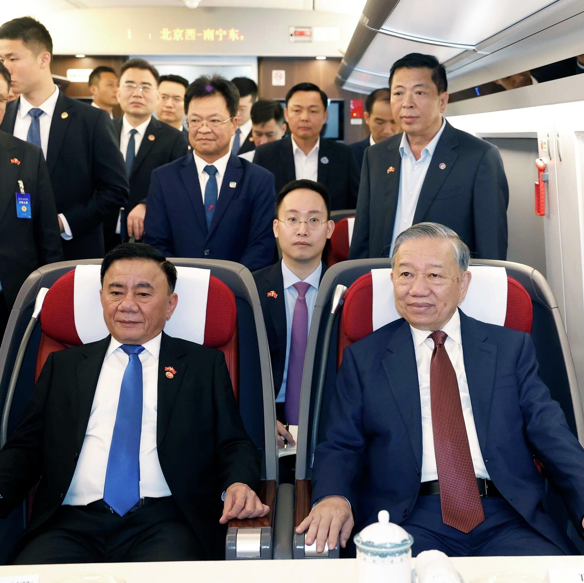 Trên tàu, lãnh đạo doanh nghiệp ngành đường sắt Trung Quốc đã báo cáo nhanh với Tổng Bí thư, Chủ tịch nước Tô Lâm về sự phát triển của ngành. Tính đến đầu năm 2026, hệ thống đường sắt đang vận hành của Trung Quốc đạt tổng chiều dài 165.000 km. Trong đó, đường sắt cao tốc khoảng 54.000 km, dẫn đầu thế giới và chiếm hơn 70% tổng chiều dài đường sắt cao tốc toàn cầu.Từ khi ban hành Quy hoạch mạng lưới đường sắt trung và dài hạn năm 2004, Trung Quốc đã nhanh chóng xây dựng mạng lưới kết nối rộng khắp các đô thị lớn, hiện đại hàng đầu thế giới, với tỷ lệ kết nối tới các thành phố có từ 200.000 dân trở lên đạt 99%; hơn 130 địa phương cấp huyện trên toàn quốc đã có đường sắt. Tổng chiều dài đường sắt vận hành của Trung Quốc tăng từ 68.700 km năm 2000 lên 165.000 km hiện nay, tương đương khoảng 2,4 lần.Trung Quốc đặt mục tiêu đến hết năm 2035 hình thành mạng lưới giao thông hiện đại, chất lượng cao với tổng chiều dài khoảng 700.000 km. Trong đó, đường sắt đạt 200.000 km, đóng vai trò chủ đạo trong hệ thống giao thông, kết nối toàn bộ các đơn vị hành chính cấp huyện trở lên, cửa khẩu biên giới và các khu vực hạ tầng quan trọng.Tổng Bí thư, Chủ tịch nước Tô Lâm bày tỏ ấn tượng về quá trình phát triển mạng lưới đường sắt cao tốc của Trung Quốc, đồng thời mong muốn hai nước tiếp tục tăng cường hợp tác kết nối giao thông, bao gồm đường sắt, vì sự phát triển xanh và tăng trưởng quốc gia.Tổng Bí thư, Chủ tịch nước Tô Lâm đề nghị lãnh đạo ngành đường sắt và các doanh nghiệp Trung Quốc chia sẻ kinh nghiệm, hỗ trợ và tham gia cùng Việt Nam trong quá trình xây dựng, chuyển giao công nghệ đối với các dự án đường sắt quan trọng.Hồi tháng 3, tại buổi kiểm tra thực tế về tình hình triển khai hợp tác, kết nối đường sắt Việt Nam - Trung Quốc tại tỉnh Lạng Sơn, Tổng Bí thư, Chủ tịch nước Tô Lâm khẳng định hợp tác song phương trong lĩnh vực đường sắt là nhu cầu và cơ hội. Tổng Bí thư, Chủ tịch nước cho rằng nếu thực hiện tốt, quản trị đúng, đây sẽ là một trong những không gian hợp tác thiết thực, giúp giảm chi phí logistics, thời gian vận chuyển, thúc đẩy thương mại và phát triển kinh tế biên giới, nâng cao năng lực thông quan, giảm ùn tắc tại cửa khẩu đường bộ, đồng thời kết nối Việt Nam với mạng lưới vận tải đường sắt Á - Âu.